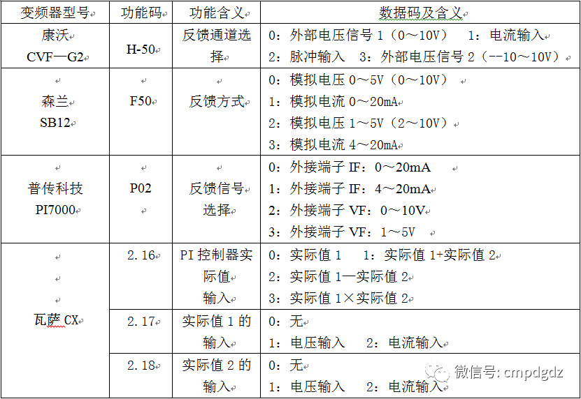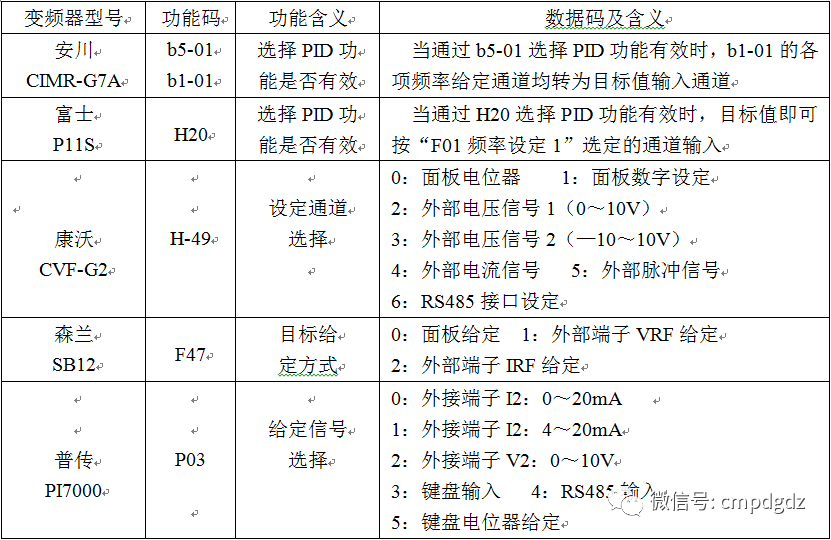 关于如何向变频器发送目标值(目标信号)的指令信息,各个变频器选择了不同的方法,但总结起来大致分为以下2种方案。 一种是如表2的zydz和富士P11S变频器那样,变频器的预置PID功能有效时,开环运行时的频率指定功能自动转移到目标值指定的自动转换法。 第二种是频道选择法,类似表2中的康沃尔斯CVF-G2、森兰SB12和普传PI7000系列变频器。