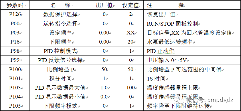 应用电路见图3。图中的变频器为创世CSBG型、规格为30kW的产品,其参数设置见表3-4。设置时首先通过P126(见表4)使所有参数恢复出厂值,这样作的好处是,尽管该变频器的参数有一百多个,但有相当一部分在本实例中并无实际意义;而有用的参数又有一部分可以默认使用出厂值,这使得参数设置变得相对简单。参数P98的设置(见表3-4)使PID功能有效,反馈逻辑为正动作。创世变频器有专用的反馈信号输入通道,即PID/FB1和GND端子(见图3-3),由参数P99设定反馈信号为电压输入0~5V。目标信号由参数P03设定,由于参数P103和P104已设定了温度传感器的量程上限和下限,所以这里可设定回水期望的温度绝对值,具体数值,可比出水温度高5~10℃,根据空调房间的降温要求确定。冷冻水循环水泵在运行中不允许停机,所以对参数P16和P105进行了设置。变频器的其它有效应用参数在表4中没有列出,默认使用出厂值。