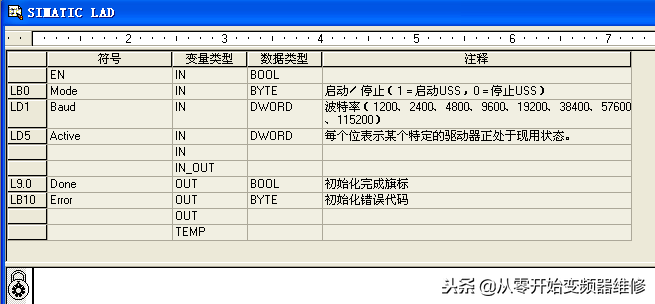 USS_INIT变频器初始化子程序是一个带参数的加密子程序,如图所示。程序中使用了所有的局部变量。使用此子程序时,输入(IN)/输出(out)变量应根据图中所示的局部变量表L,按照指示的数据类型赋值。