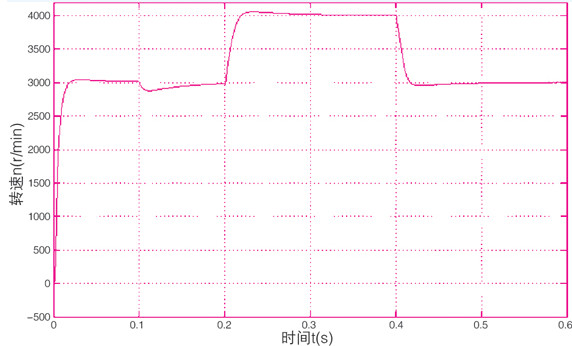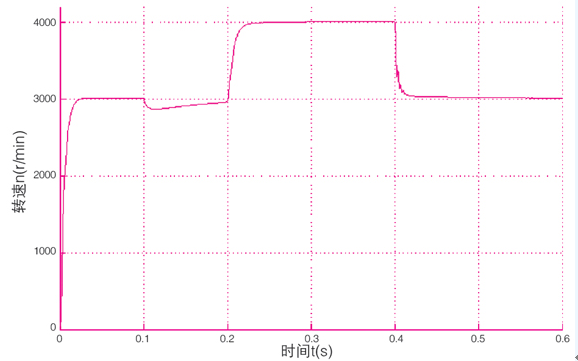 仿真设置如下:电机空载启动,初始给定转速为3000r/min,0.1s时加入额定负载3n.m,0.2s时转速增加到4000r/min,0.4s时转速再降回3000r/min。转速环和电流环都采用pi调节器进行调节。其中速度pi调节器参数为kp=0.06,ki=0.75;d轴电流调节器参数为kp=4.5,ki =1.8;q轴电流调节器参数为kp=6.5,ki =1.8。