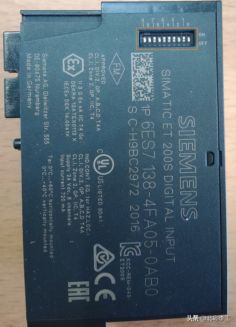 例如,下图为ET200S的故障安全数字量输入模块,模块上部有一系列DIP开关,共有10个,最右边的编号为0,向左依次增加。 把开关转到上面的ON位置表示数字1,转到下面的OFF位置表示数字0;