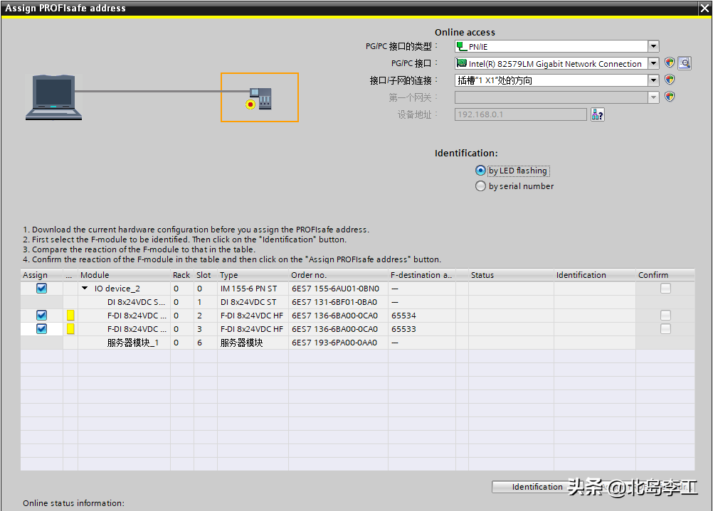 在显示的对话框中,选中标记为黄色的故障安全模块,单击“识别”识别按钮。 识别完成后,勾选右侧的“Confirm”确认栏,点击“Assign PROFIsafe address”分配地址。 请参照下图。