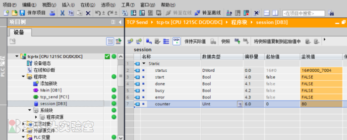 块分为输入区域(DI、AI )、输出区域) DQ、AQ )、程序块) DB )等。 在下图中,DB3是测试程序的数据块。