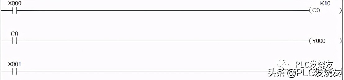 最基础的用法,如图2-0-4,X0的按钮按下10次后,C0的常开触点就会导通,触发Y0线圈进行输出;X1按钮按下C0的线圈断电并且计数值被清空,C0常开触点就断开,Y0线圈停止输出。