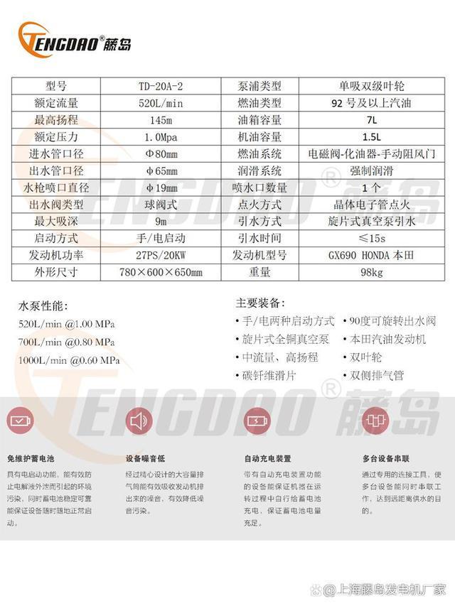 TD-20A-2型高扬程手抬机动消防泵是采用本田GX690发动机与上海藤岛实业有限公司生产的双极水泵配套制造的。具有结构紧凑、启动方便、出水迅速、油耗低、重量轻、工作可靠等特点。对于狭路、深巷及消防车辆不能通行场所,更具有独特灵活机动的优点,是消防灭火、专职消防队、森林消防队、城镇、农村、工矿企业、义务消防队扑救一般物质火灾及小型油类火灾的理想设备.