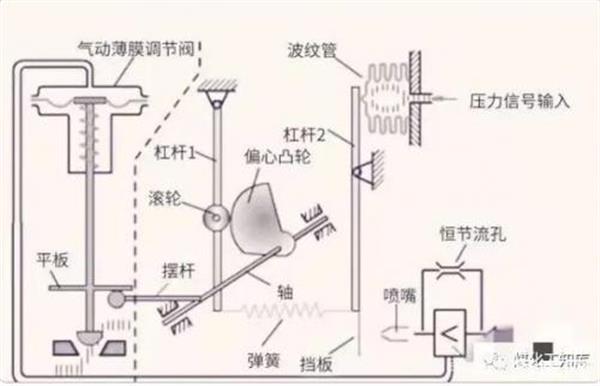 当控制器输出的电信号转变为与之相对应的气信号时,然后将转换后的气信号作用在波纹管上。杠杆2则绕着支点运动,杠杆2下段向右运动靠近喷嘴。喷嘴的背压增加,经过气动放大器放大后(图中那个带小于符号的部件),将气源的一部分送入到气动薄膜的气室,阀杆带着阀芯向下自动逐渐将阀门开度变小。此时,与阀杆相连的反馈杆(图中摆杆)绕着支点向下移动,使轴的前端向下移动,与其连接的偏心凸轮做逆时针旋转,滚轮顺时针旋转向左移动,从而拉伸反馈弹簧。由于反馈弹簧拉伸杠杆2下段向左移动,此时就会与作用在波纹管上的信号压力达到力平衡,于是阀门就固定在某个位置不动作了。
