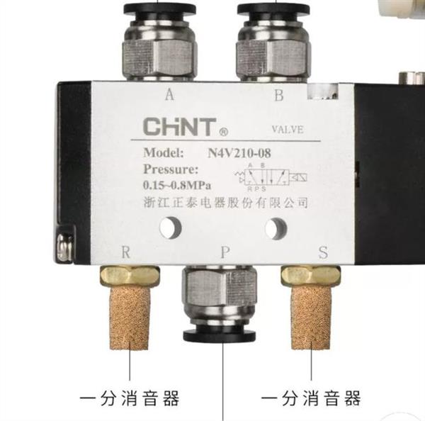 通过上面的实物图清晰可见,其有五个接口,P口接压缩空气进,A接口和B接口分别接压缩空气出,用于气缸动作。R接口和S接口用于气缸排气,安装***防止噪声过大。